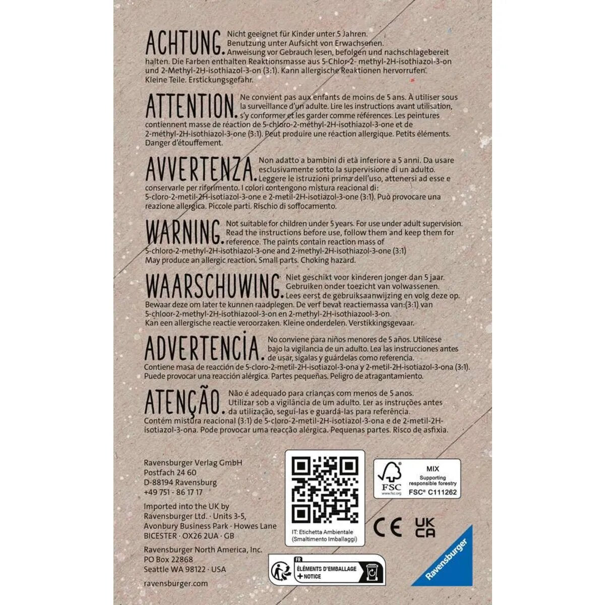 Achtung. Nicht geeignet für Kinder unter 5 Jahren. Benutzung unter Aufsicht von Erwachsenen. Anweisung vor Gebrauch lesen, befolgen und nachschlagebereit halten. Die Farben enthalten Reaktionsmasse aus 5-Chlor-2- methyl-2H-isothiazol-3-on und 2-Methyl-2H-isothiazol-3-on (3:1) Kann allergische Reaktionen hervorrufen.