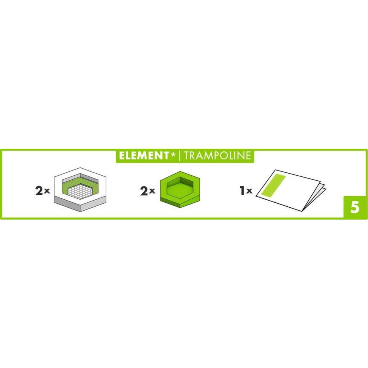 Inhalt: Anleitung (sprachneutral/international), 2 Elements Trampolin, 2 grüne Winkelsteine