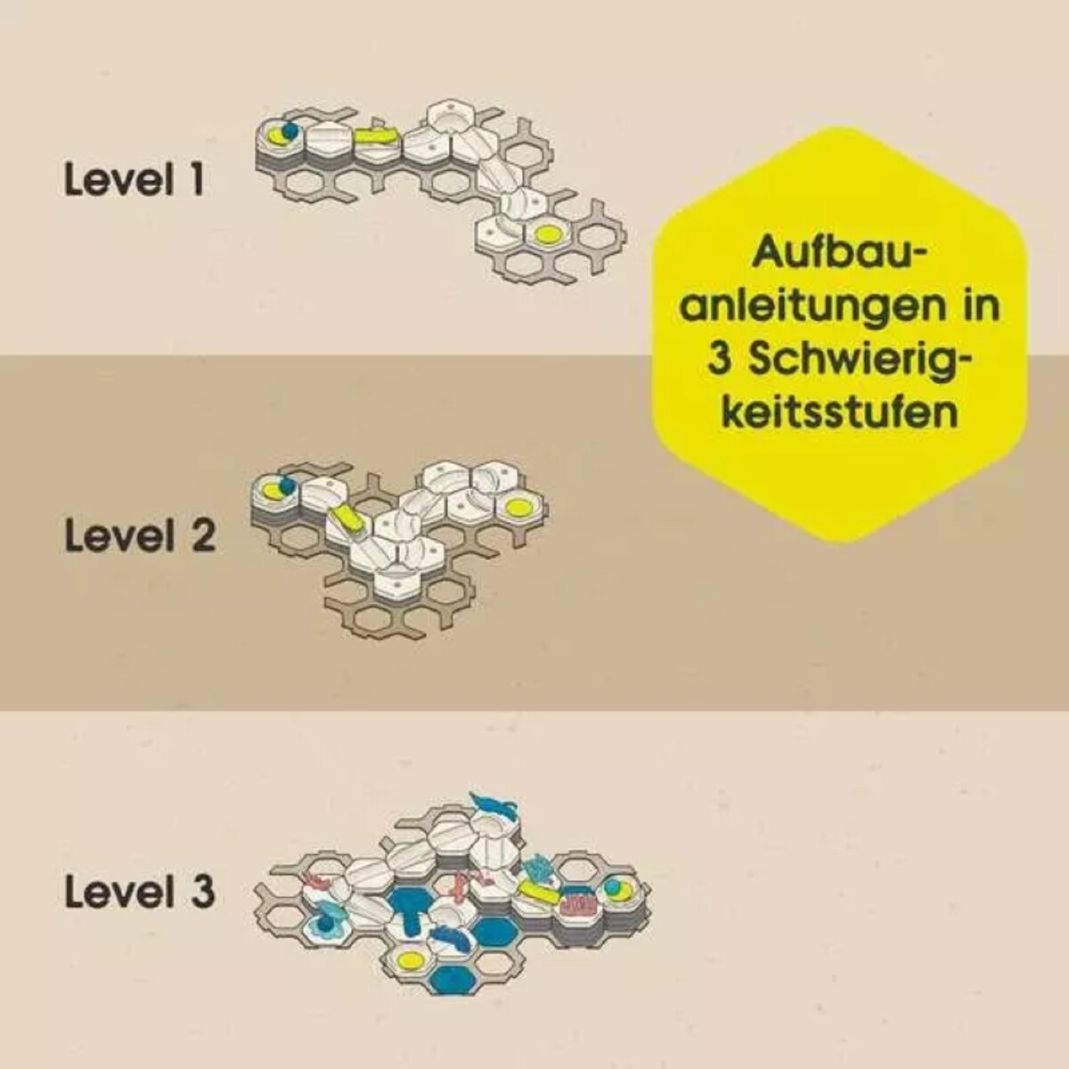 Durch verschiedene Erweiterungen können Kinder ihre Kugelbahnen vergrößern und immer wieder neu gestalten - langanhaltender Spielespaß garantiert.