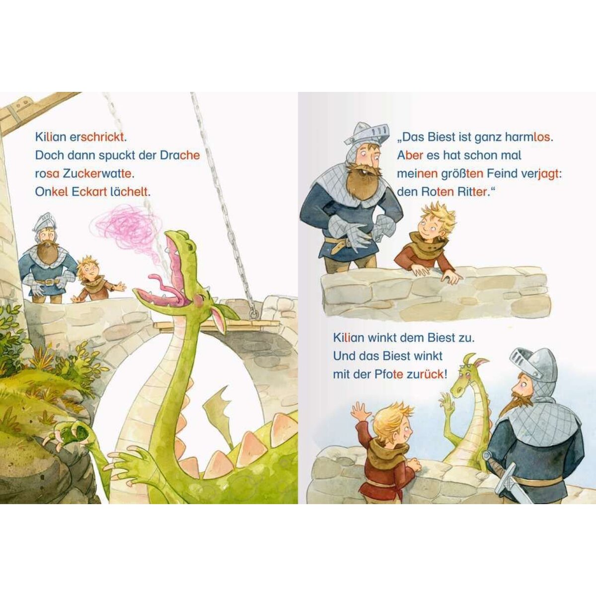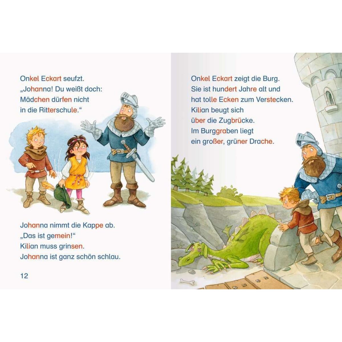 Lesen lernen wie im Flug!Kilian ist glücklich: Er darf bei seinem Onkel Eckart zur Ritterschule gehen. Bei seinen Streifzügen durch die Burg trifft er Johanna, die sich versteckt: Für Mädchen ist die Schule nämlich nicht erlaubt. Als eines Tages der Rote Ritter die Burg angreifen will, kann die tapfere Johanna beweisen, was in ihr steckt: Gemeinsam mit Kilian und dem Zuckerwatte speienden Drachen verteidigt sie die Ritterburg!Die Kinderbücher der Reihe Leserabe wurden mit Pädagogen entwickelt und richten sich sowohl an Leseanfänger ab der 1. Klasse als auch an fortgeschrittene Erstleser ab der 2. Klasse. Die original Mildenberger Silbenmethode fördert die Lesekompetenz: Silben in Blau und Rot helfen beim Lesenlernen und verbessern nachweislich die Rechtschreibung.