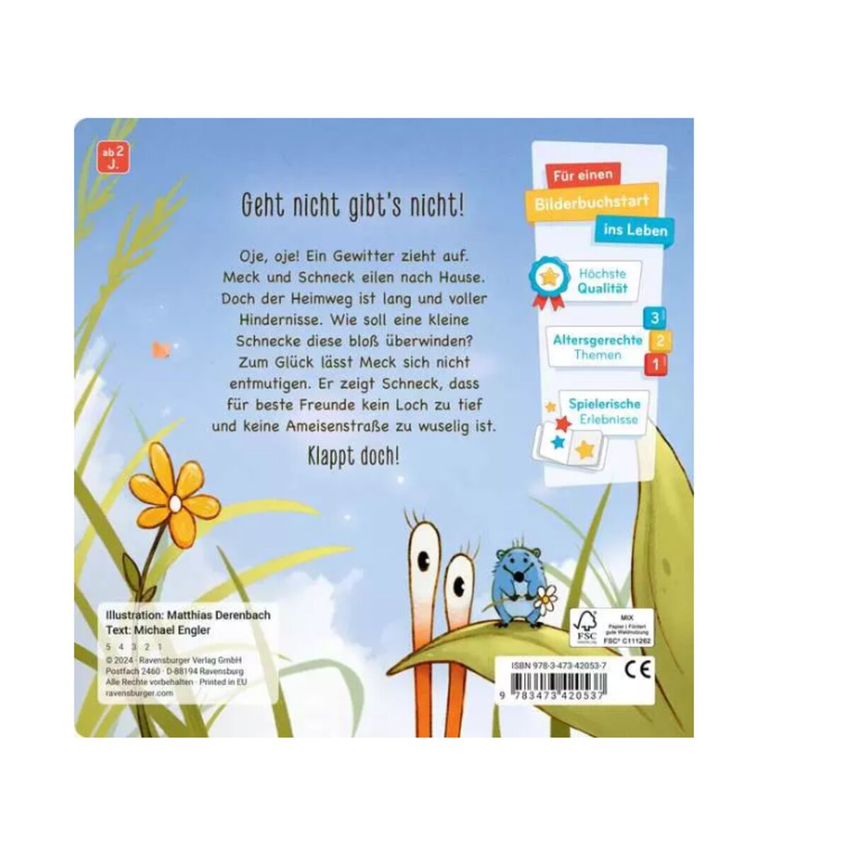 Meck und Schneck erzählen uns eine wunderbare Geschichte darüber, dass sich mit einem guten Freund an der Seite jedes Hindernis überwinden lässt!