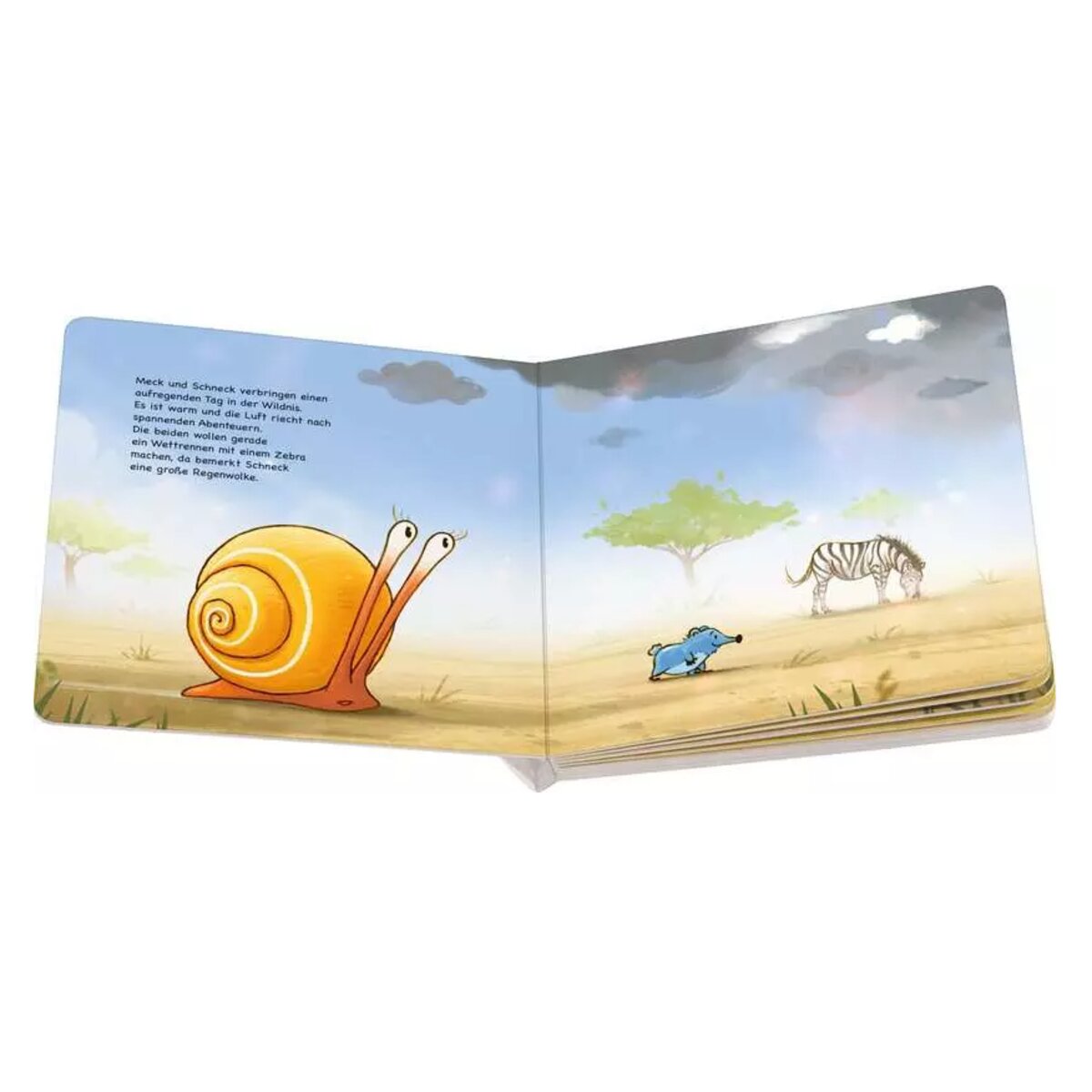Schneck entdeckt eine große Regenwolke mit Blitz und Donner am Himmel. Nun aber schnell zurück zur Höhle. Aber auf ihrem Weg ins sichere Versteck warten ungeahnte Hindernisse auf die Freunde. Was kann eine kleine Schnecke dagegen bloß ausrichten? Doch Meck zeigt Schneck, dass für beste Freunde kein Weg zu weit, kein Loch zu tief und keine Ameisenstraße zu wuselig ist!