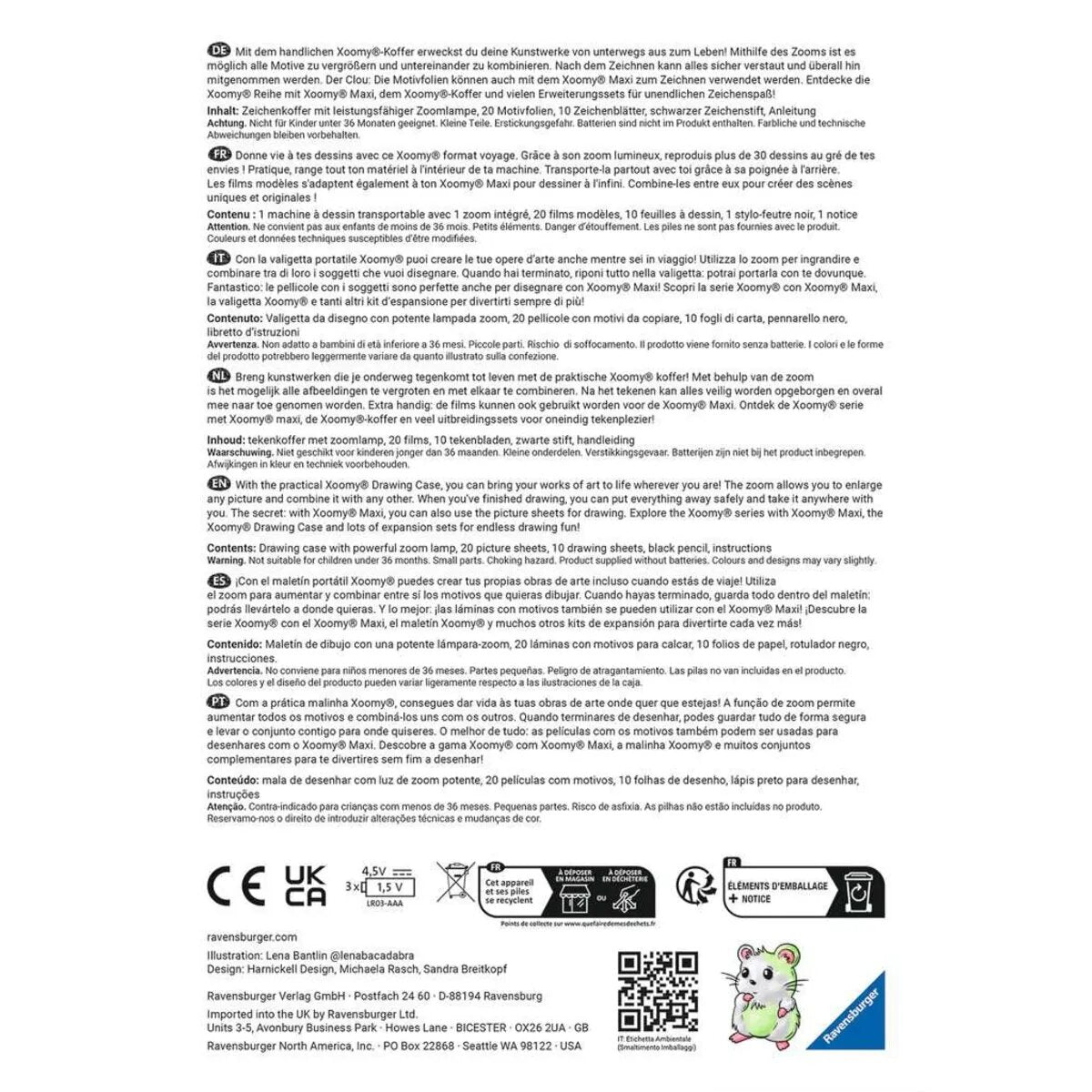 Mit dem Ravensburger Xoomy® Midi lernen Kinder ab 6 Jahren ganz einfach zeichnen. Dank des Lichttisches und der LED-Zoomlampe haben Kinder schnell das gewünschte Motiv auf das Papier projiziert. Es stehen über 30 Motive zur Auswahl, um eigene Geschichten zu zeichnen und fantastische Welten zu erschaffen. Das gesamte Malset mit Stift, 10 Bogen Papier, 20 Motivfolien und Profi-Zoomlampe kann praktisch im Koffer verstaut und auf Reisen mitgenommen werden. Figuren zum Leben erwecken und aufregende Geschichten zeichnen: Mit dem Xoomy® Midi Zeichenkoffer von Ravensburger wird jedes Kind ab 6 Jahren zum Zeichenprofi – auch von unterwegs aus. Mit der LED-Zoomlampe kinderleicht die gewünschten Motive auf das Papier projizieren und auf weißem Papier eigene Geschichten und fantastische Welten entstehen lassen. Möchte ein Kind seinen eigenen Comic erfinden und lernen, Gesichter und Tiere zu zeichnen? Mit den Xoomy® Produkten von Ravensburger gelingt das ganz einfach. Der Xoomy® Midi kommt im handlichen Kofferset, in dem alle notwendigen Utensilien enthalten sind. Mit den Ravensburger Xoomy® Reihen Maxi, Midi und den Erweiterungssets für einen unendlichen Zeichenspaß.