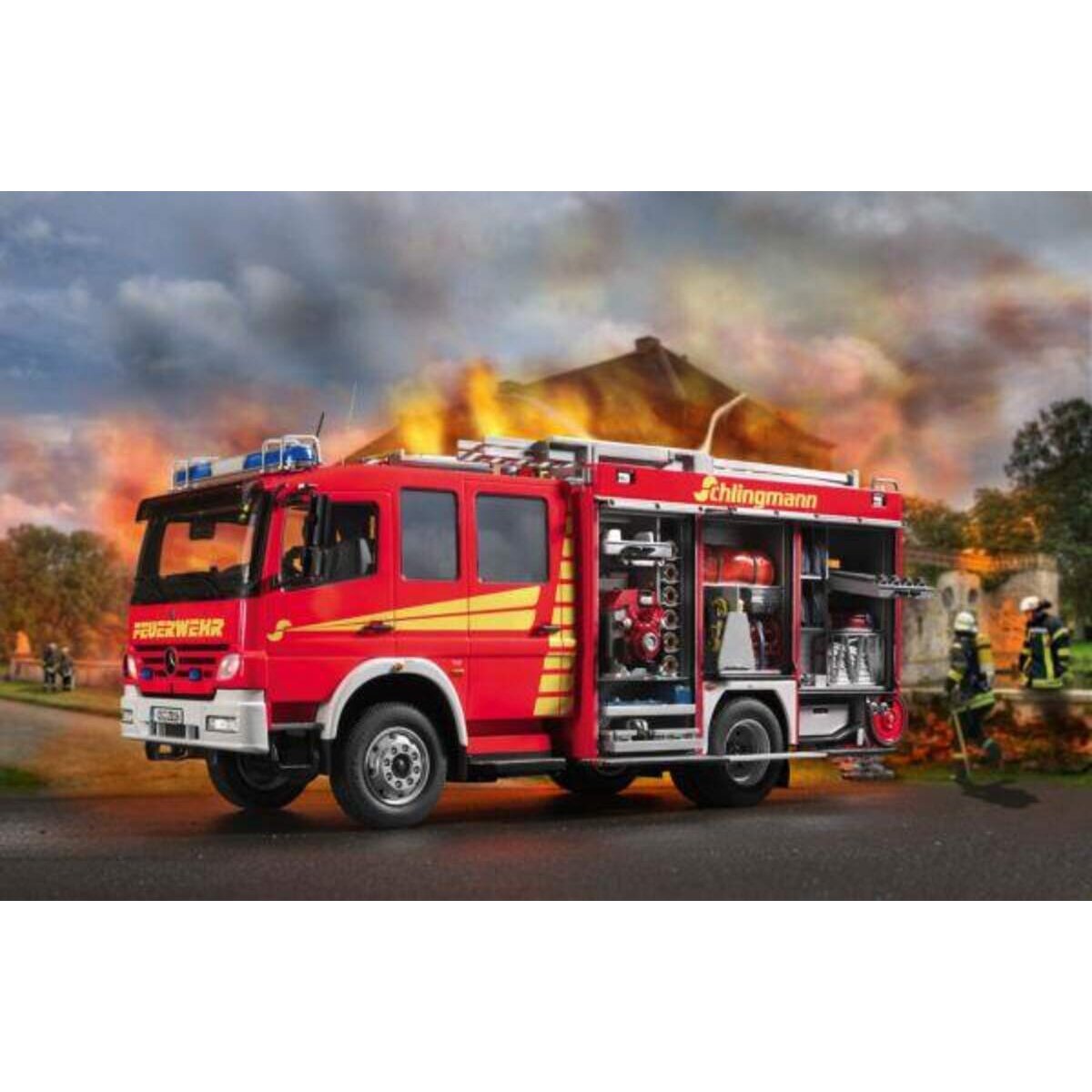 Die Feuerwehr versteht sich als Hilfsorganisation mit Aufgaben wie Hilfeleistung bei Verkehrs- und Chemie-Unfällen, Überschwemmungen, Feuersbrünsten und allen denkbaren Katastrophen. Das Schlingmann LF20/16 (Löschgruppenfahrzeug), basierend auf einem "Mercedes Benz Atego 1529 AF", ist ein Fahrzeug, welches aufgrund seiner umfangreichen Feuerlöschausrüstung meist als Erstangreifer zu Bränden ausrückt. Es verfügt über einen Löschwassertank (2.400 Liter) und ist zudem für die einfache technische Unfallhilfe ausgerüstet. Für die Wasserförderung steht eine Feuerlöschkreiselpumpe, die mit 10 bar Druck bis zu 2.000 Liter Wasser pro Minute fördert, zur Verfügung. Am Heck befindet sich die fahrbare Schlauchhaspel mit Platz für 8 B-Schläuche. Auf dem Dach befinden sich Leitern und ein ausfahrbarer Lichtmast. Mit 279 PS und Allradantrieb kommt die Besatzung, bestehend aus 9 Personen, schnell und sicher zum Einsatzort. Ob ein Hausbrand, ein Verkehrsunfall, oder eine zu rettende Katze im Baum, das LF20/16 ist fürdie meisten Einsatzfälle ausgerüstet. Sämtliche Geräteräume lassen sich im Modell öffnen und ermöglichen einen detaillierten Einblick in die umfangreiche Ausrüstung. Die am Heck befindliche Schlauchhaspel ist ebenso berücksichtigt wie die Leitern auf dem Dach. Der detaillierte Fahrer- und Mannschaftraum beinhaltet auch Atemschutzgeräte, die während der Fahrt angelegt werden können. Im Vergleich zum HLF 20/16 besitzt das LF 20/16 eine umfangreichere Feuerlöschausrüstung, die im Modell berücksichtigt wurde.