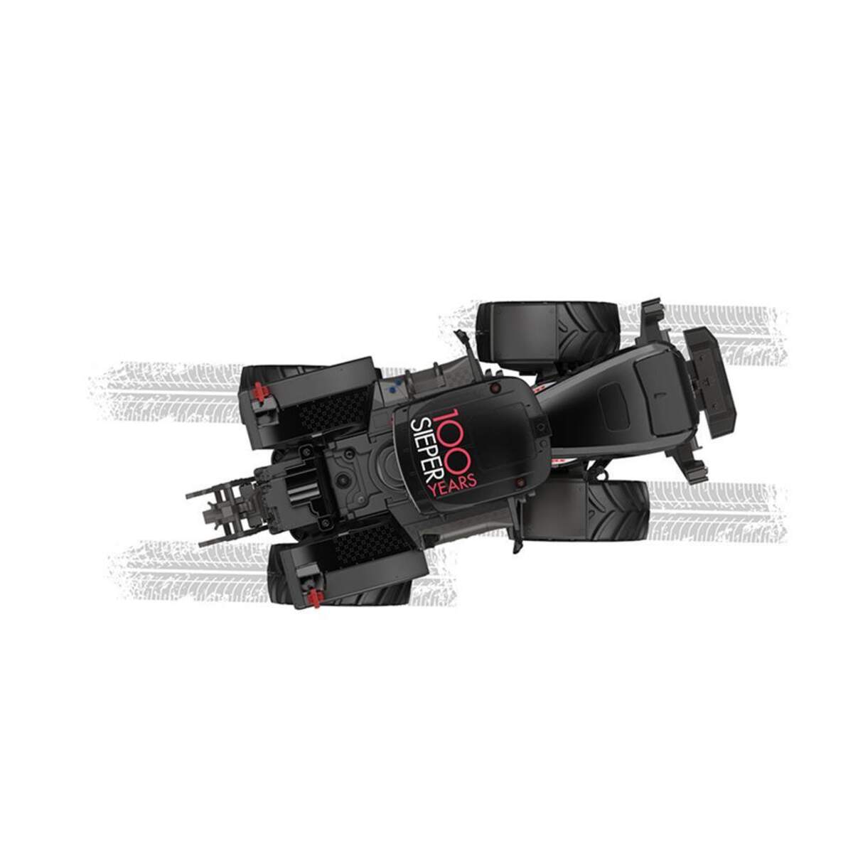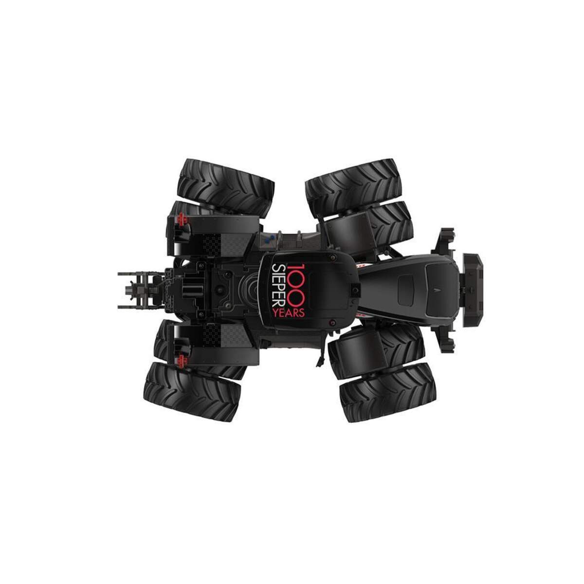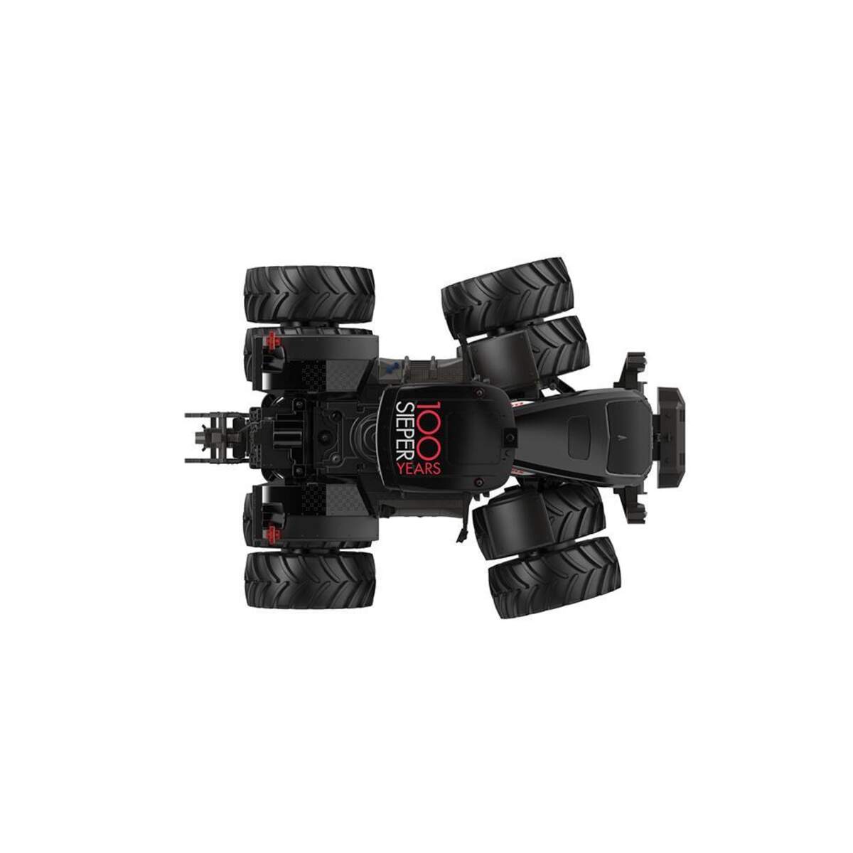 Mächtiges RC Modell für schwerste Aufgaben Der Claas Xerion 5000 TRAC VC ist bereits in der Serienausführung eine imposante Erscheinung. Das Jubiläumsmodell „100 Jahre Sieper“ in mattschwarzer Lackierung und mit Doppelbereifung macht noch mehr Eindruck. Die einzigartige Ausführung ist limitiert. Arbeitsbeleuchtung an, Arbeitsgerät ankuppeln und ab damit auf den Acker. Mit der SIKUCONTROL APP lassen sich mit Smartphone und Tablet die sechs Getriebe, die 22 LEDs und die zahlreichen Funktionen des Traktors steuern. Die Funktionen können wahlweise über die virtuelle Gamepad-Steuerung oder die Bewegungssensoren der mobilen Geräte gesteuert werden. Dieses intuitive Feature bietet zusätzlichen Spielspaß. Per Knopfdruck wird, wie beim Original, die gesamte Kabine gedreht. Vor allem beim Mulchen und bei Siloarbeiten ermöglicht dies eine gute Sicht auf das Heck. Die Steuerung erkennt die geänderte Fahrtrichtung und passt die Steuerbefehle an. Zudem kann das Modell, wie beim Original, über die Hinterachse, mit der Allradlenkung oder mit der sogenannten Hundeganglenkung angetrieben und gelenkt werden. Dabei werden die Vorderräder und die Hinterräder in die gleiche Richtung ausgelenkt. Dies ermöglicht, die Hinterräder auch bei Geradeausfahrt versetzt zu den Vorderrädern laufen zu lassen. Dies reduziert die Spurrinnenbildung und vermindert die Kippgefahr. Die Zwillingsbereifung vermindert zusätzlich bei weichen Böden den Bodendruck des Traktors. Die Reifen sind mit Magneten verbunden, die in den Felgen integriert sind und diese fest verbinden. Dadurch können die Reifen werkzeuglos und sehr schnell an- und abmontiert werden. Die SIKUCONTROL APP steht kostenlos zum Download im App Store und im Google Play Store bereit. Die Einstellungen und Funktionen der App werden laufend aktualisiert. Mit der OTA (Over-The-Air)-Funktion der App kann auch die Software des Traktors direkt aktualisiert werden.