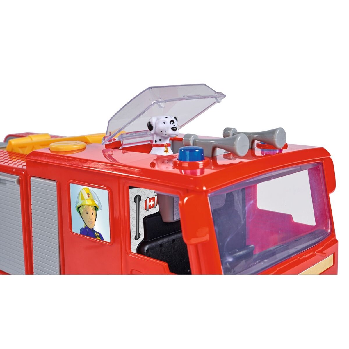 • Großer Feuerwehrwagen - Jupiter ist das große Feuerwehrauto von Feuerwehrmann Sam und seinen Kollegen, mit dem sie zu vielen Einsätzen fahren. Der Feuerwehrwagen ist 31cm lang und besitzt eine Aussichtskuppel für Hund Schnuffi.